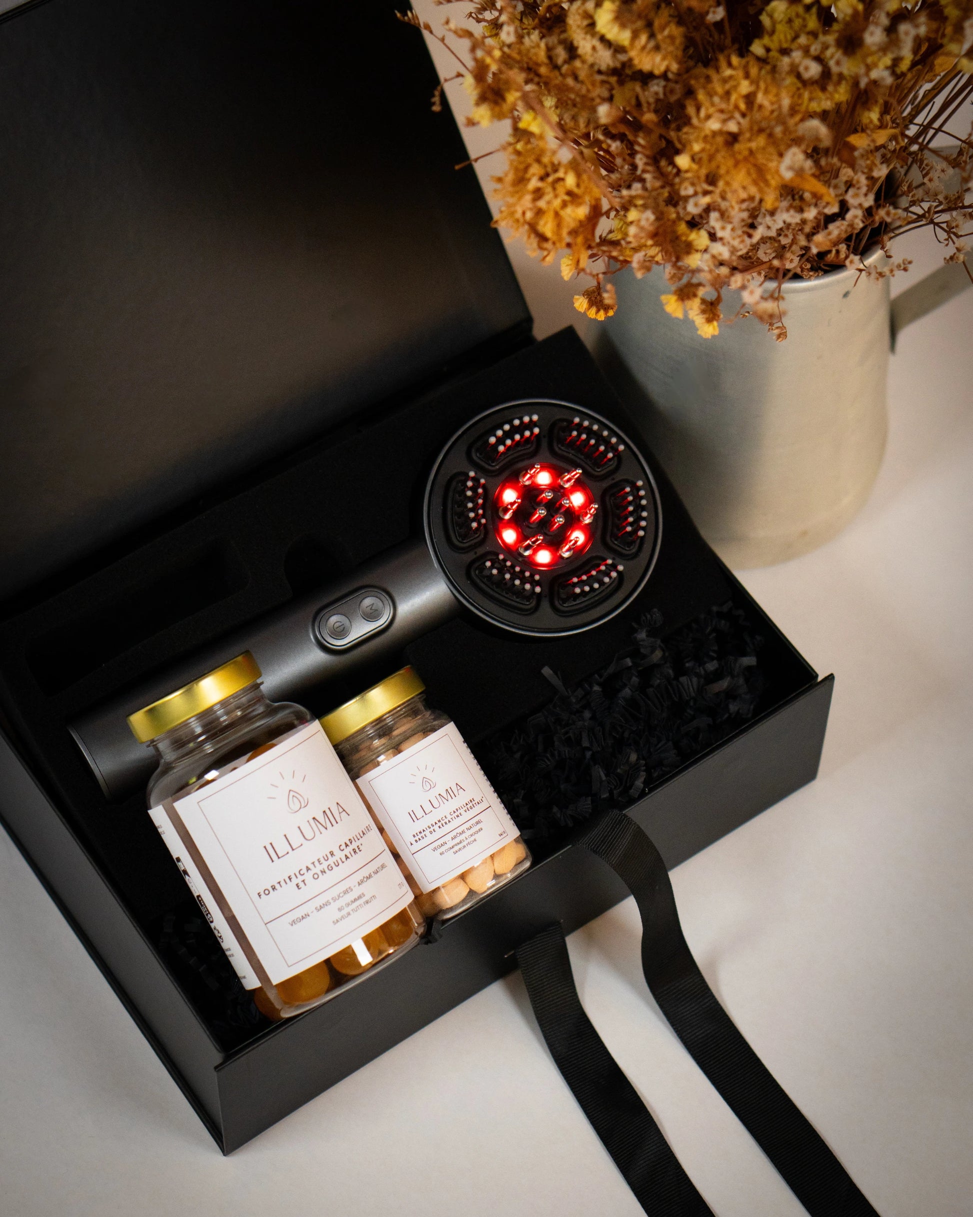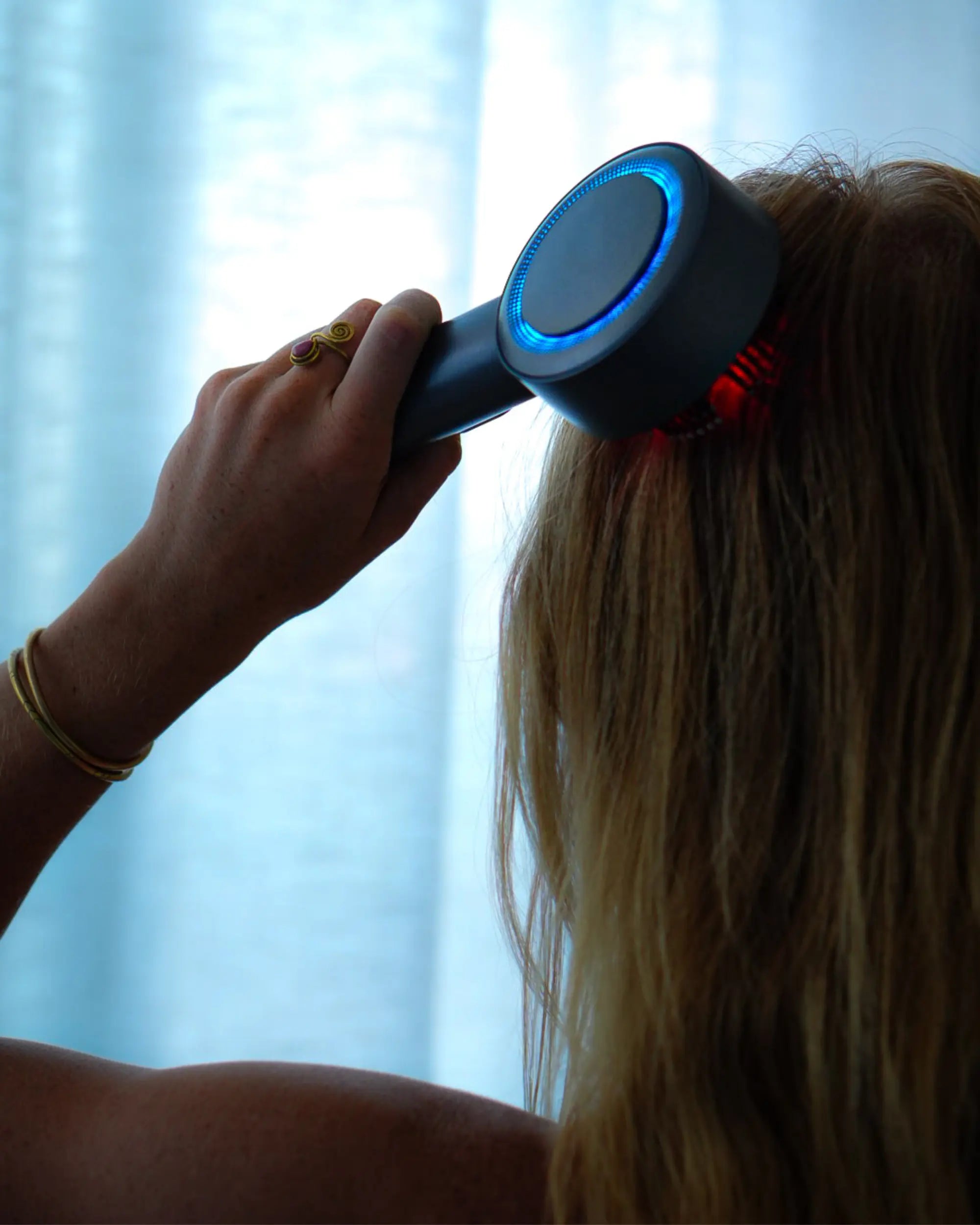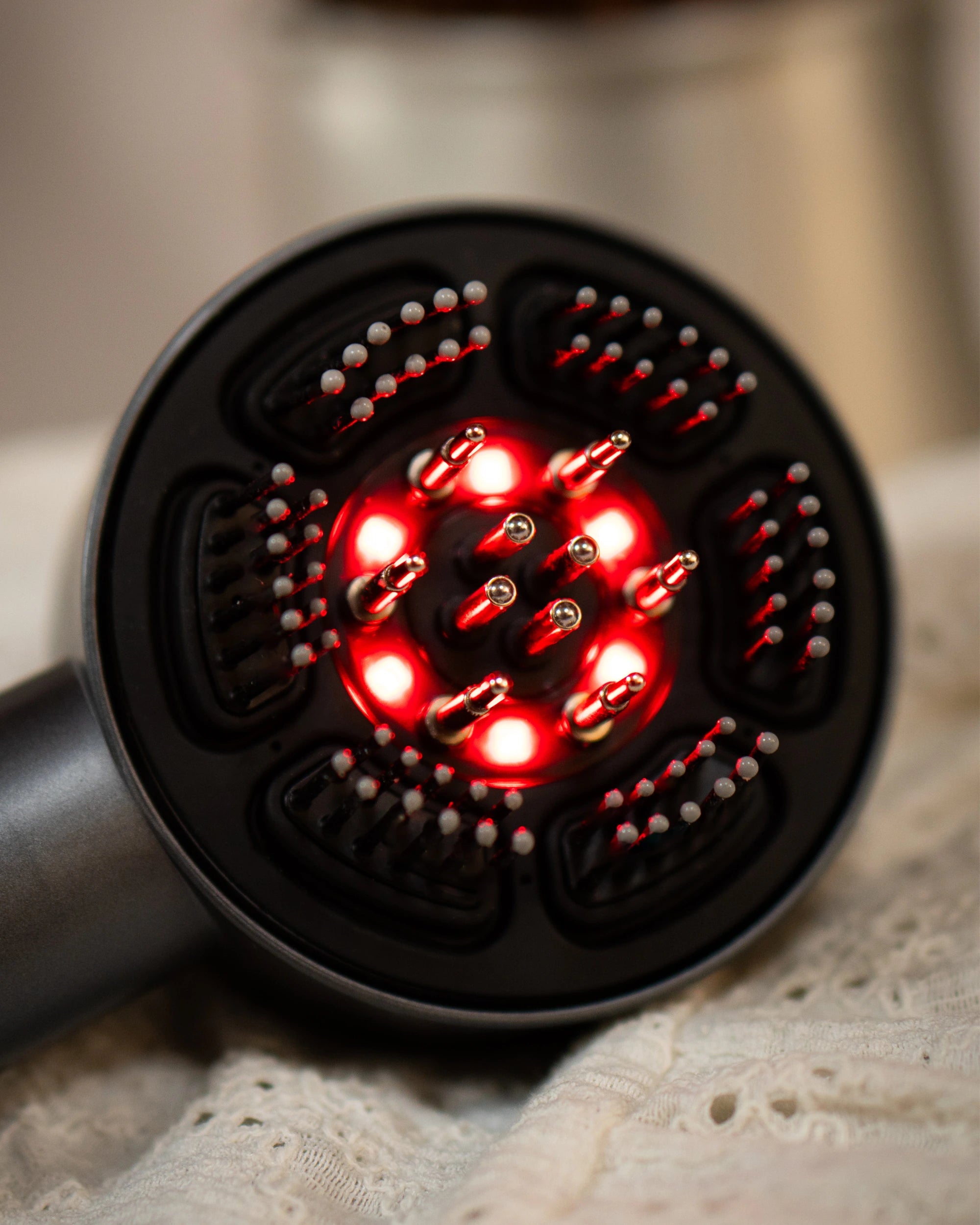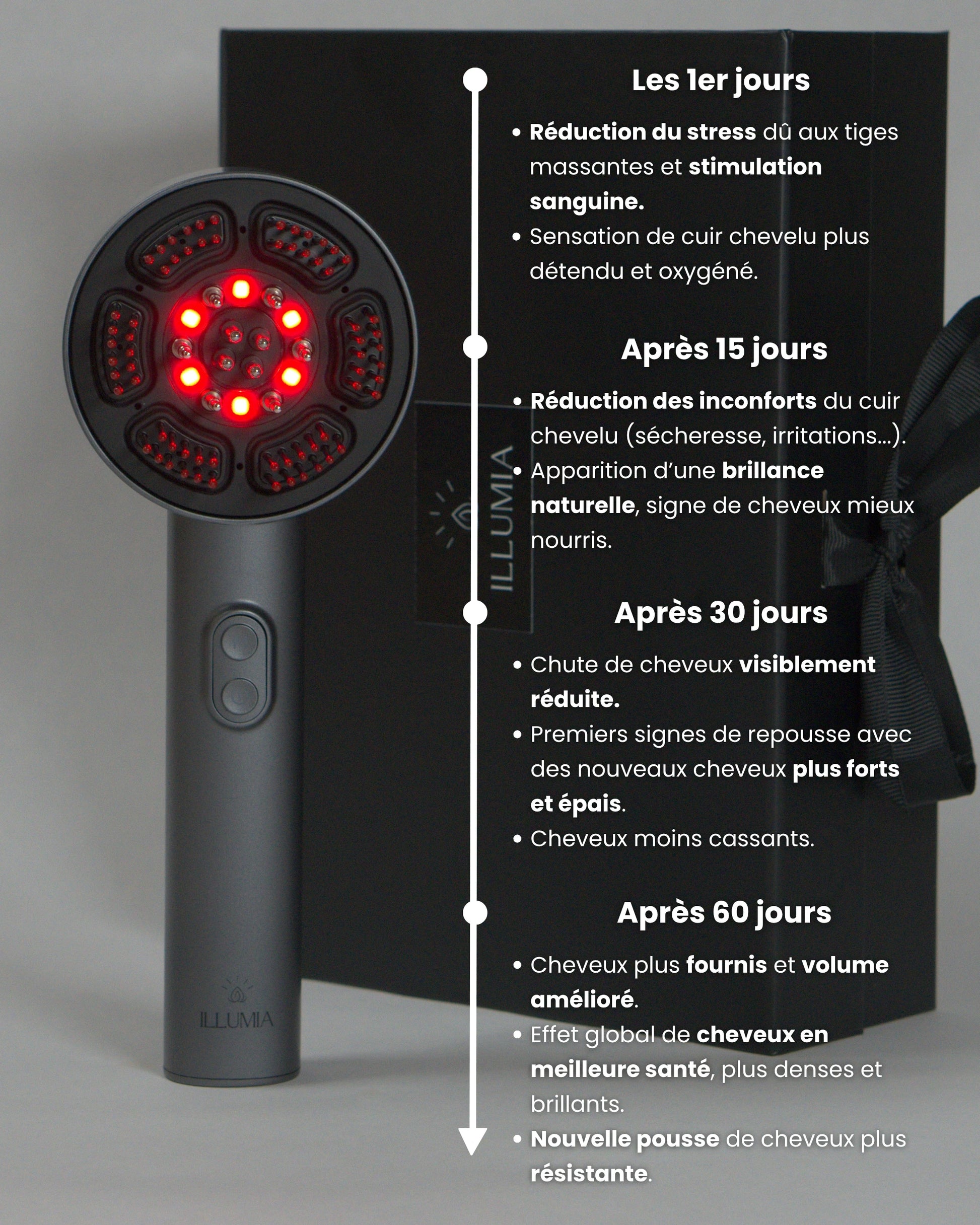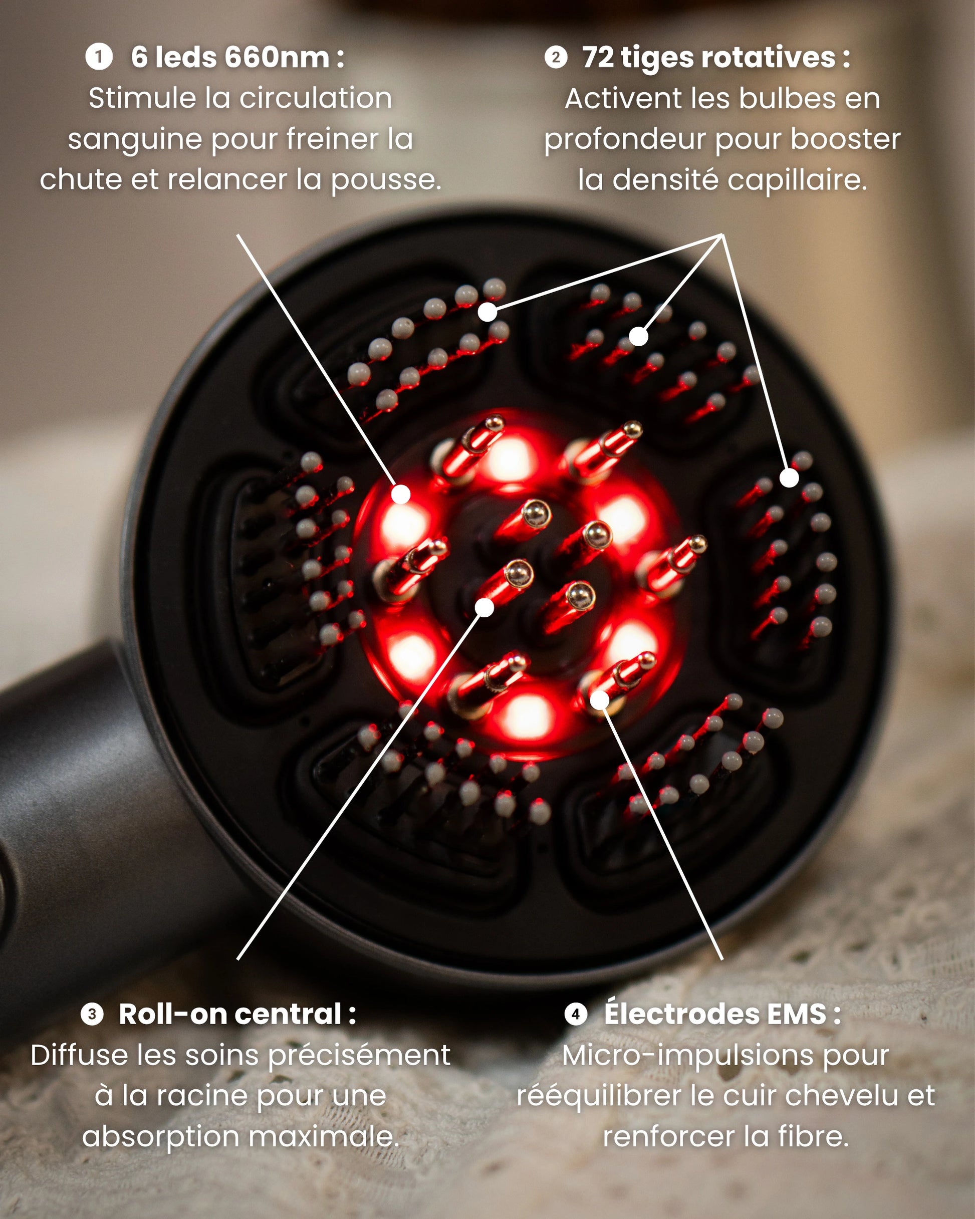 Lumière rouge : Réactive la microcirculation et stimule la régénération cellulaire pour ancrer durablement le cheveu à sa racine.